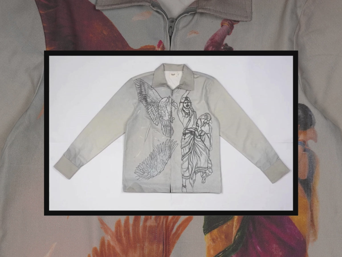 This jacket is executed through the ancient discipline of vegetable/plant pigment printing. Grounded in GOTS-certified organic cotton, the fabric serves as a modern manuscript for Raja Ravi Varma’s 1906 lithographic masterpiece, Jatayu Vadh. The printing process is an alchemical extraction of the earth: reds derived from madder roots (Rubia tinctorum) to symbolize the martyr’s blood, and blacks fermented from iron rust and jaggery to depict the shadow of Ravana. By transferring this mythological moment onto organic canvas using plant-based pastes, turning the garment into a mobile fresco that honors the anthropological link between storytelling, divinity, and the natural world.